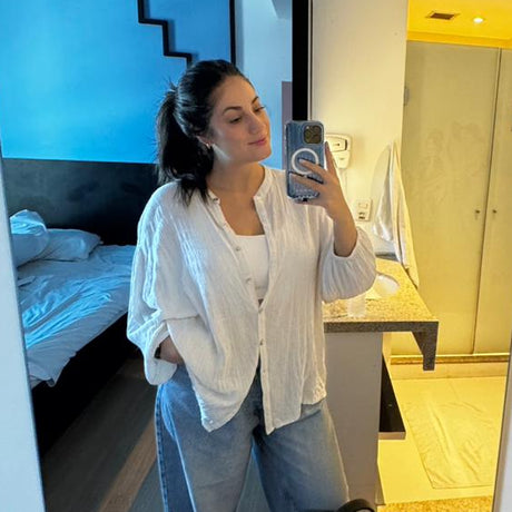Com modelagem oversized e caimento soltinho, a Camisa Lia é perfeita para criar looks descomplicados e elegantes. As mangas longas com elástico nos punhos e os botões em madrepérola dão um charme extra, enquanto a gola padre traz um toque sofisticado, seja aberta ou fechada.